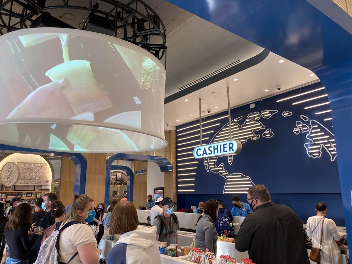 New pieces hanging from the roof serve as screens where footage of park attractions, iconography, and landmarks, such as the trademark Universal Globe, is projected onto the curvature for guests waiting in line to checkout at the cashier stand to enjoy.
