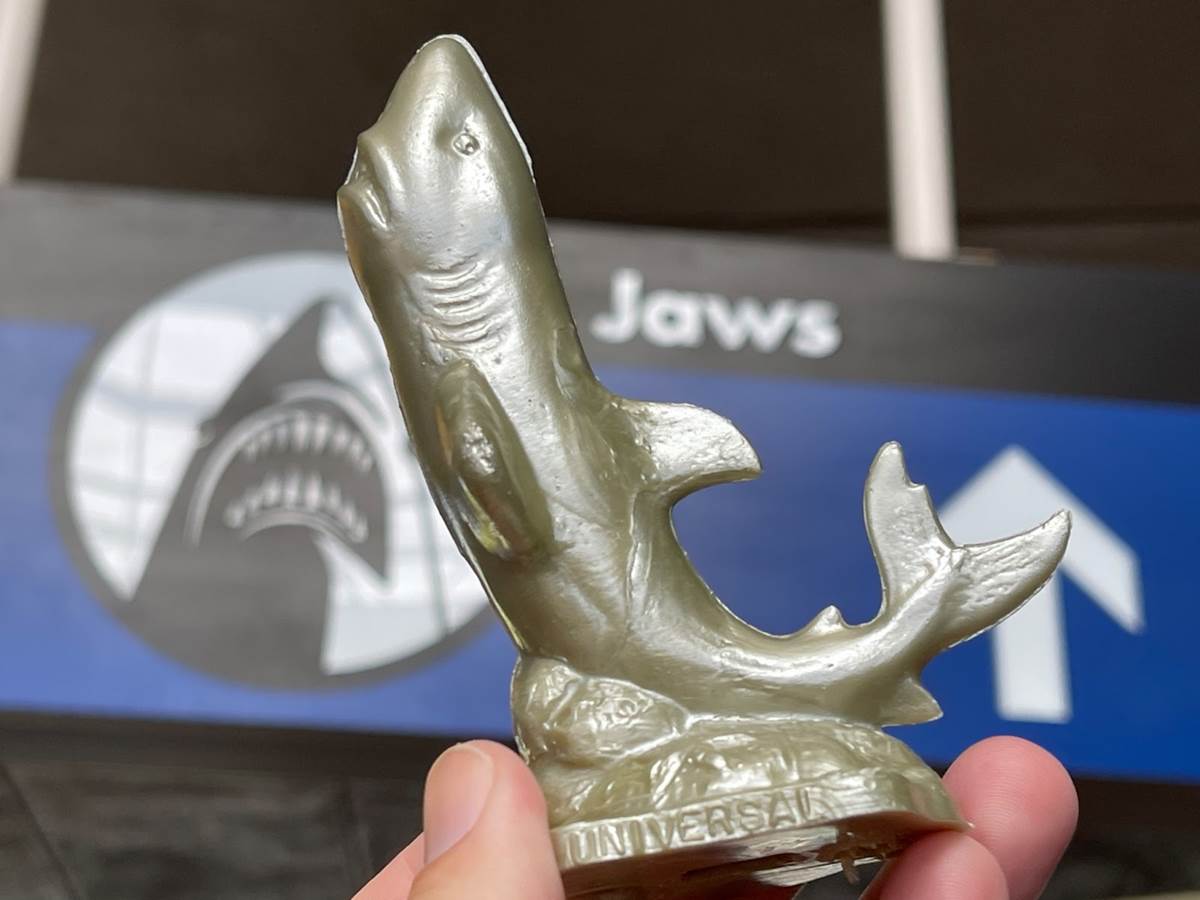 - This new version creates a figure of a shark with “Universal” stamped below. The machine itself is also themed to Jaws with photos looking at the attraction.