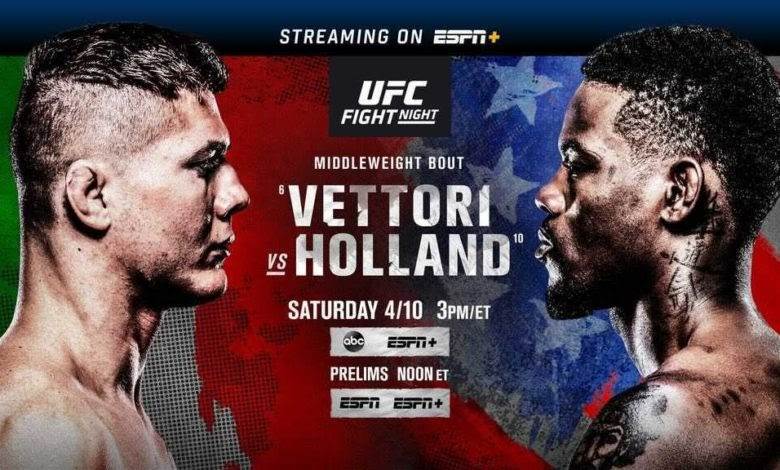 UFC Fight Night: Vettori vs. Holland is set for this Saturday, April 10, live from UFC APEX in Las Vegas. Live coverage of the prelims begins at 11:30 a.m. ET on ESPN+ and 12 p.m. ET on ESPN, ESPN Deportes and ESPN+. Main card starts at 3 p.m. ET on ESPN+ (English and Spanish) and ABC – the second time UFC airs live on ABC.