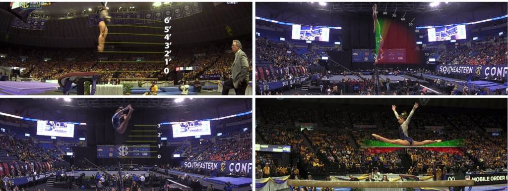 - In 2018, ESPN introduced new scoring graphics with enhanced scoring breakdowns, and continued to utilize quad-boxes and replay machines to show as many routines as possible.