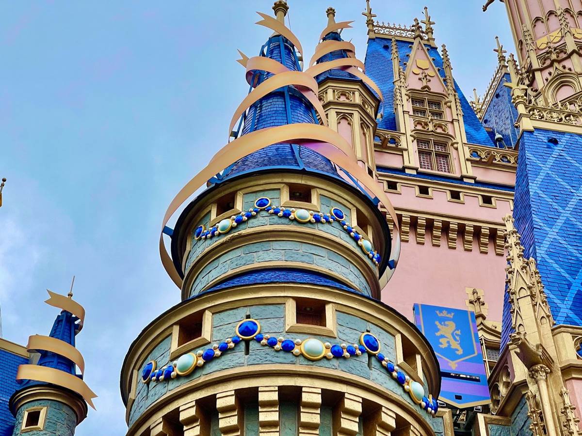 - Back when the World’s Most Magical Celebration was announced, we learned that Cinderella Castle will feature golden bunting, sparkling golden embellishments, and a 50th anniversary crest, much of which you can see in the images above.
