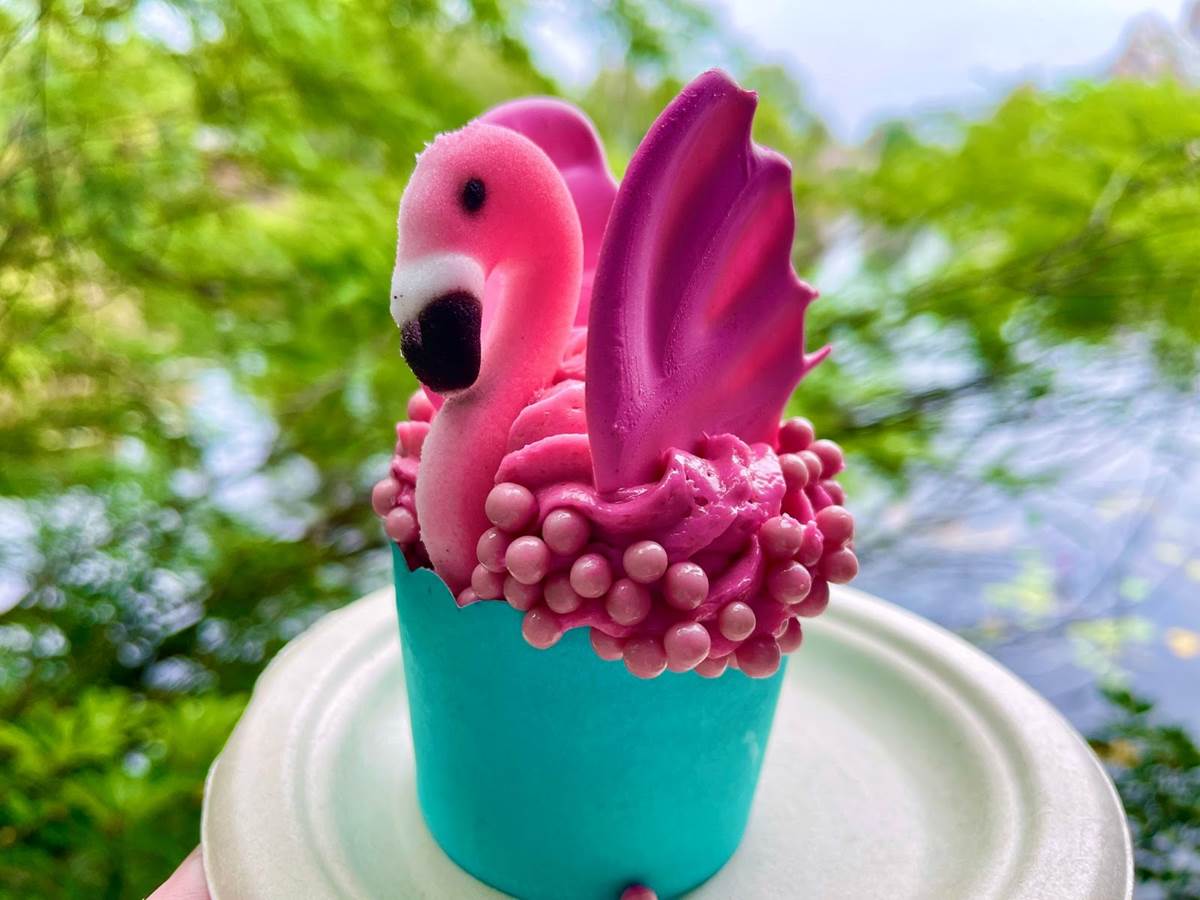 There are some special Earth Day limited time menu offerings for snacking choices, starting with a pink flamingo cupcake with strawberry pearls.