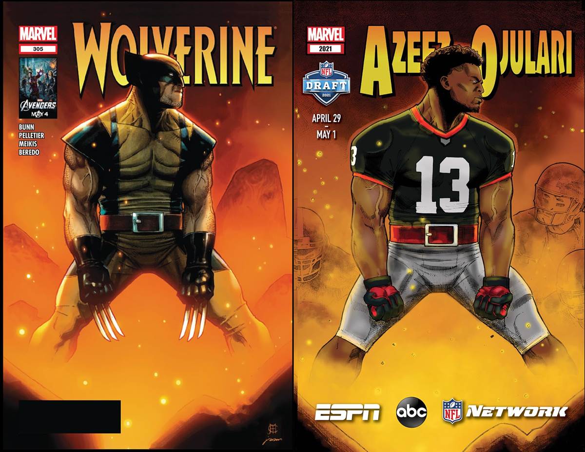 “Azeez Ojulari (Georgia) is a dominant edge rusher from the University of Georgia. Known for his explosiveness and effective use of his hands, Ojulari is agile and quick in pursuit but also has great balance and can be difficult to move. An all-around weapon for the defense, he excels at making like difficult for the opposing quarterback. Marvel’s own “weapon” is also familiar with work off the edge. Wolverine shares many traits with Ojulari… tenacity, effective use of his hands and super human toughness as he fights alongside his fellow X-Men.
