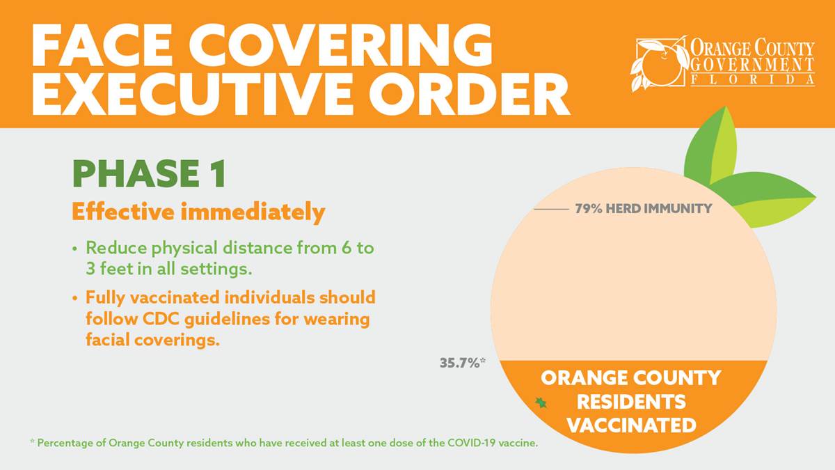 - The face-covering executive order has three phases based on when a percentage of the population receives the first dose of the COVID-19 vaccine in the county.