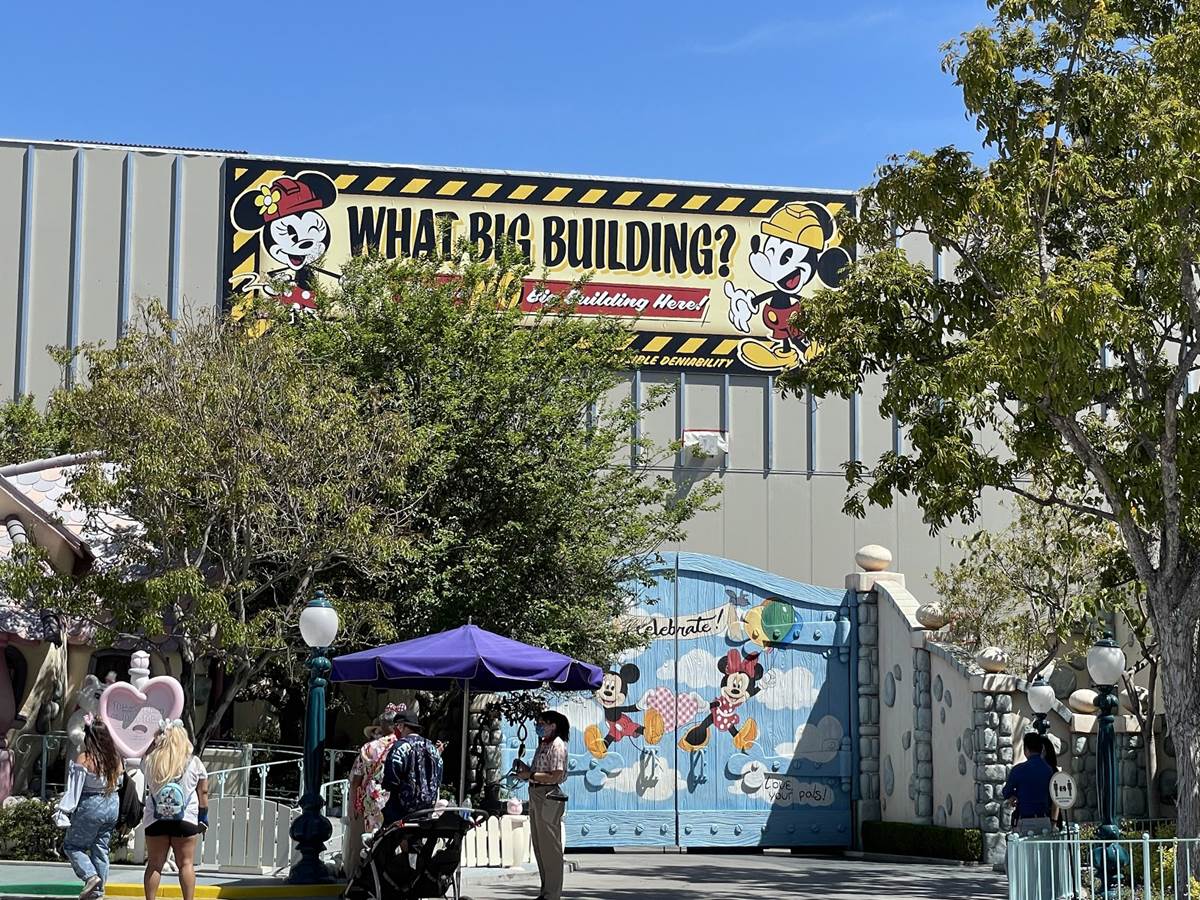 Over the last year, the skyline of Mickey’s Toontown at Disneyland Park has been drastically altered (temporarily!) as the show building for Mickey and Minnie’s Runaway Railway takes shape, with a large, hilarious banner telling us not to believe our own eyes!