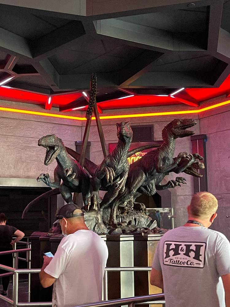 One popular spot for photos has already proven to be a statue after the entrance featuring four velociraptors in a room with brilliant light patterns as well as video screens showing off Velociraptor footage and the legendary Mr. DNA.