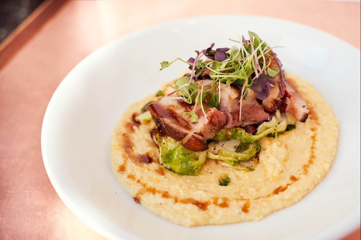 - Braised pork belly, cheddar green onion grits, roasted Brussels sprouts, stout maple glaze