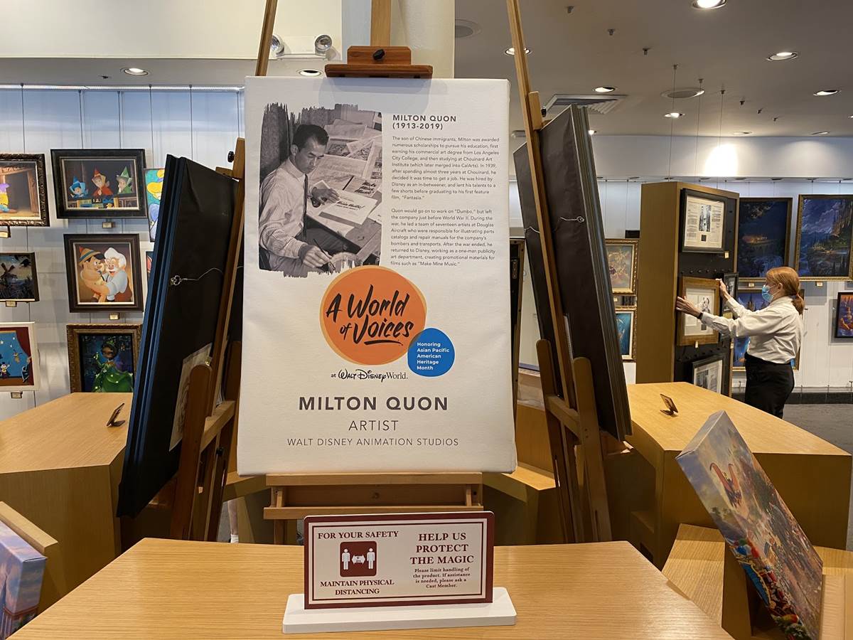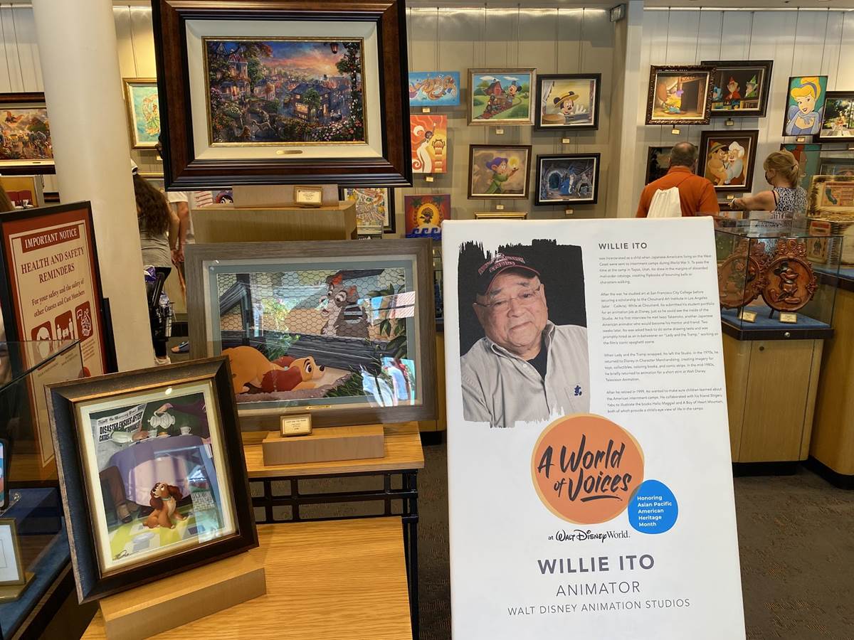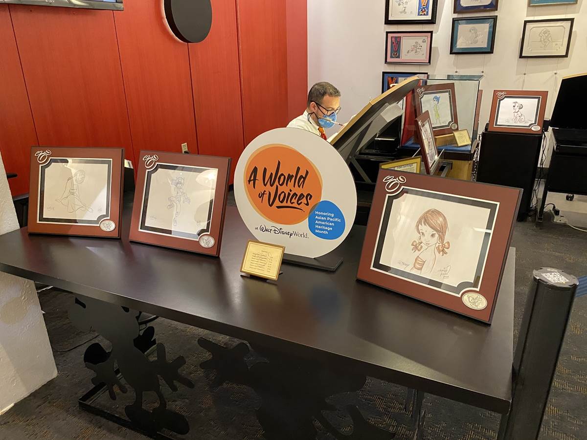 Over in the Marketplace section of Disney Springs, guests can check out the artist spotlight series at The Art of Disney where there is a focus on Asian Pacific American filmmakers, artists, authors and screenwriters who work or have worked at the Walt Disney Animation Studios including: Qui Nguyen, Mohit Kallianpur, Fawn Veerasunthorn, Willie Ito, Gyo Fujikawa, Milton Quon, and Disney Legend Tyrus Wong. Alongside the posted biographies of the artists, different pieces featuring the characters from their work are on display and for sale.