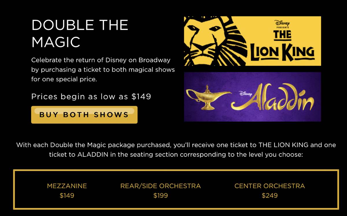 - Disney on Broadway is offering a deal giving guests tickets to both shows for one price, as low as $149.