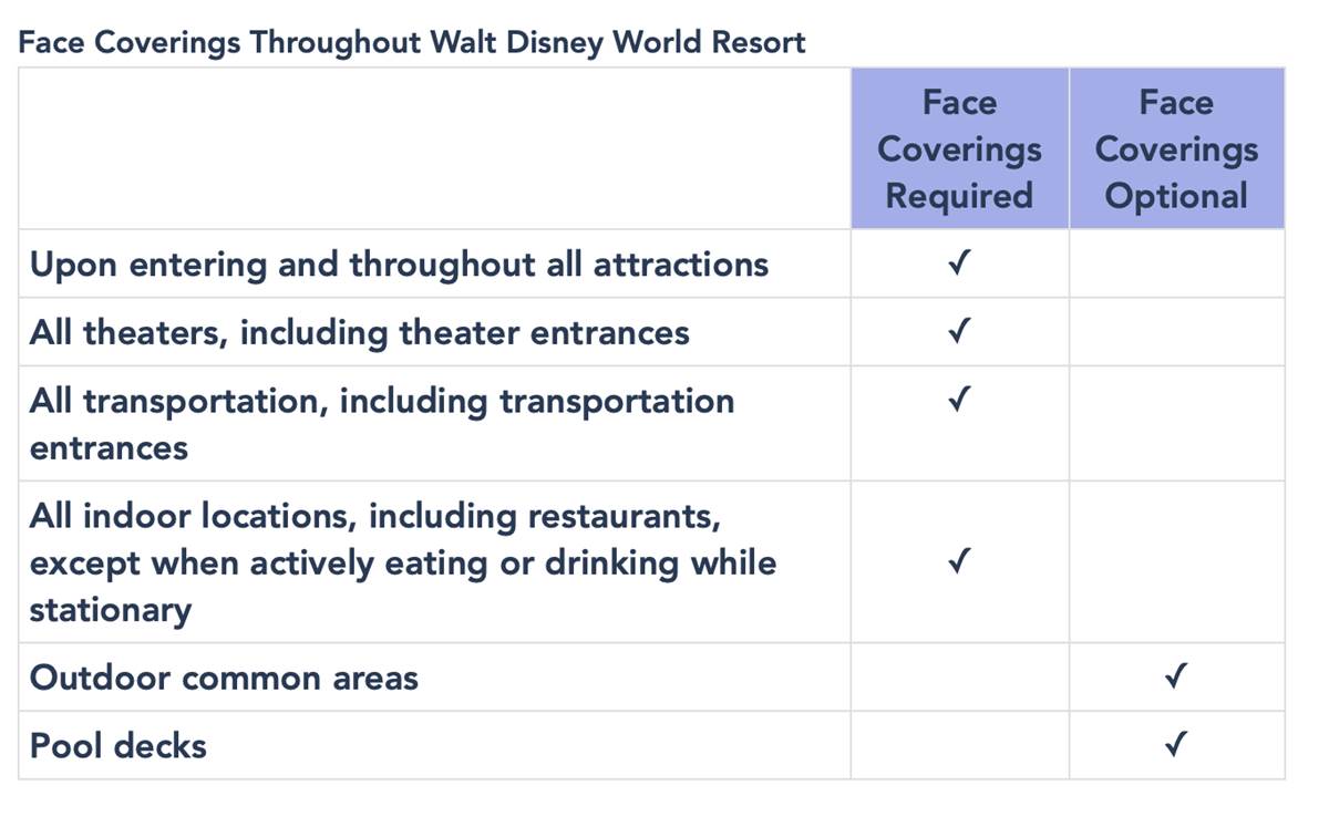 - Guests will be required to wear face masks at all indoor locations, throughout entire attraction experiences starting from the entrance of the queue through the exit, while using Walt Disney World Transportation, and theaters.