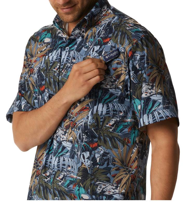 The Outer Rim collection combines elements of iconic Star Wars imagery (like the Millennium Falcon, X-wing Starfighters, TIE Fighters, Darth Vader, and Stormtrooper helmets hidden among leafy palm fronds and other types of plants) with the comfort and performance that Columbia’s PFG-- AKA Performance Fishing Gear-- apparel collections are known for. As the company states on its website, these items are “ready for wherever your outdoor journey takes you.”