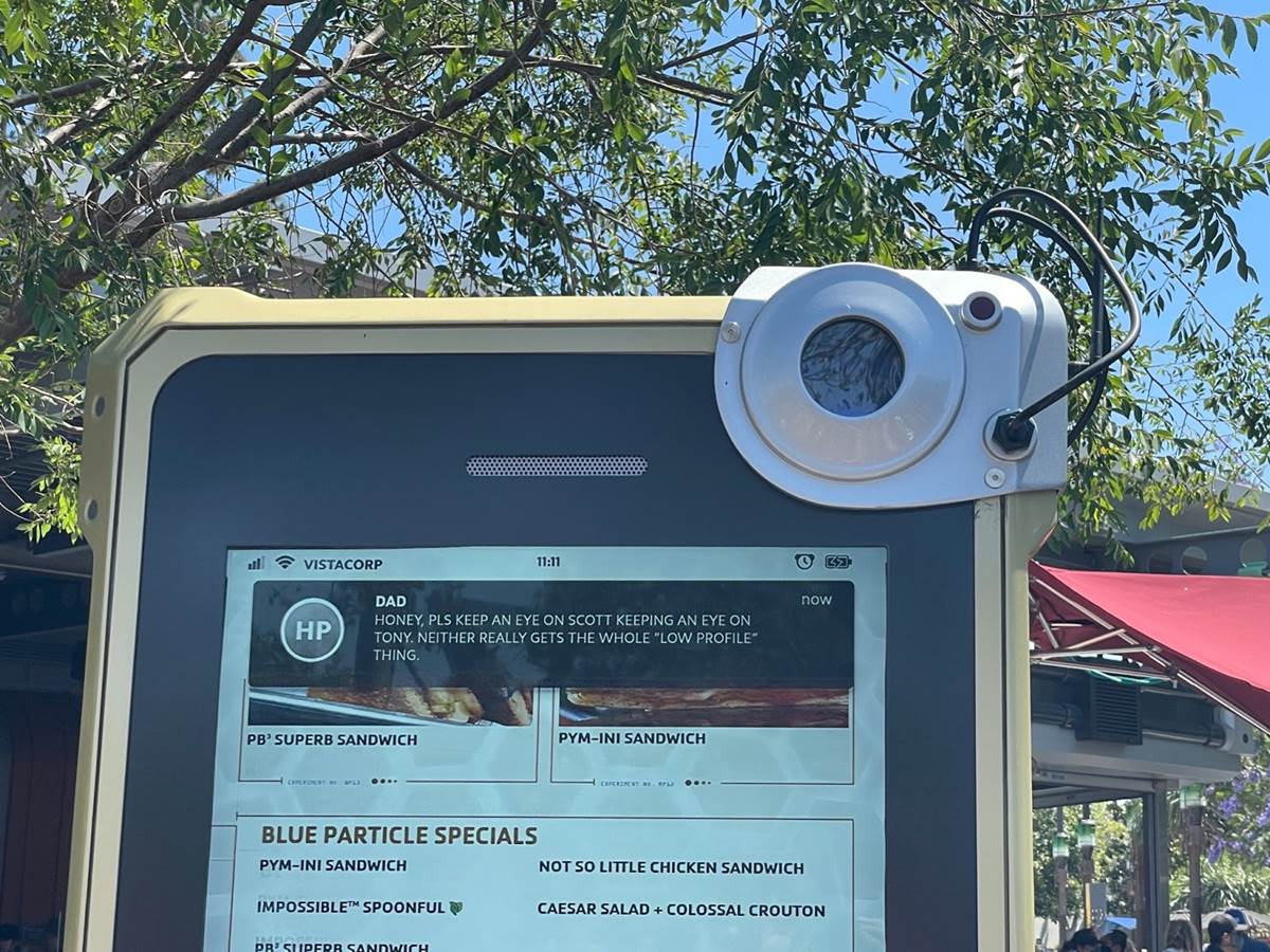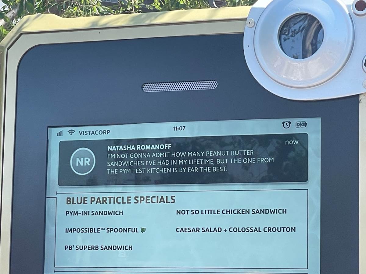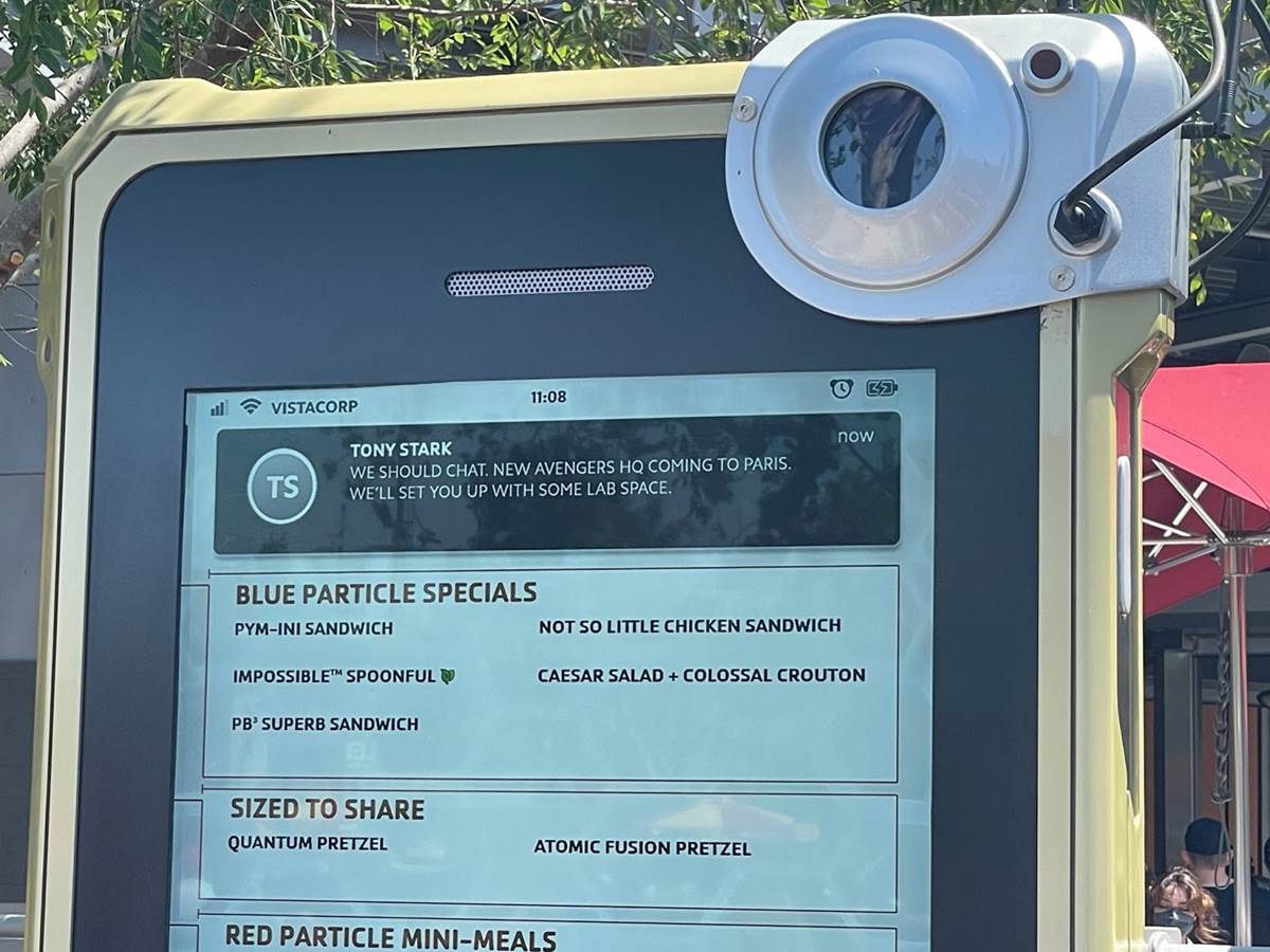 Near Pym Test Kitchen and the Pym Tasting Lab, you’ll see a digital menu board showing you all the offerings available via a giant smartphone, but you’ll also notice that smartphone receiving some notifications from Marvel characters.