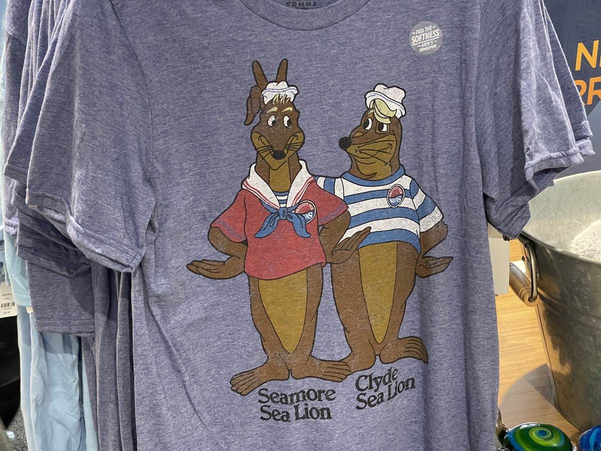 - Shirts and pins featuring classic characters that were once featured at the park along with the cartoon-ified Shamu, including Virgil Pelican, Sir Winston Walrus, and Clyde and Seamore the sea lions. The shirts featuring the classic characters retail for $27.99.