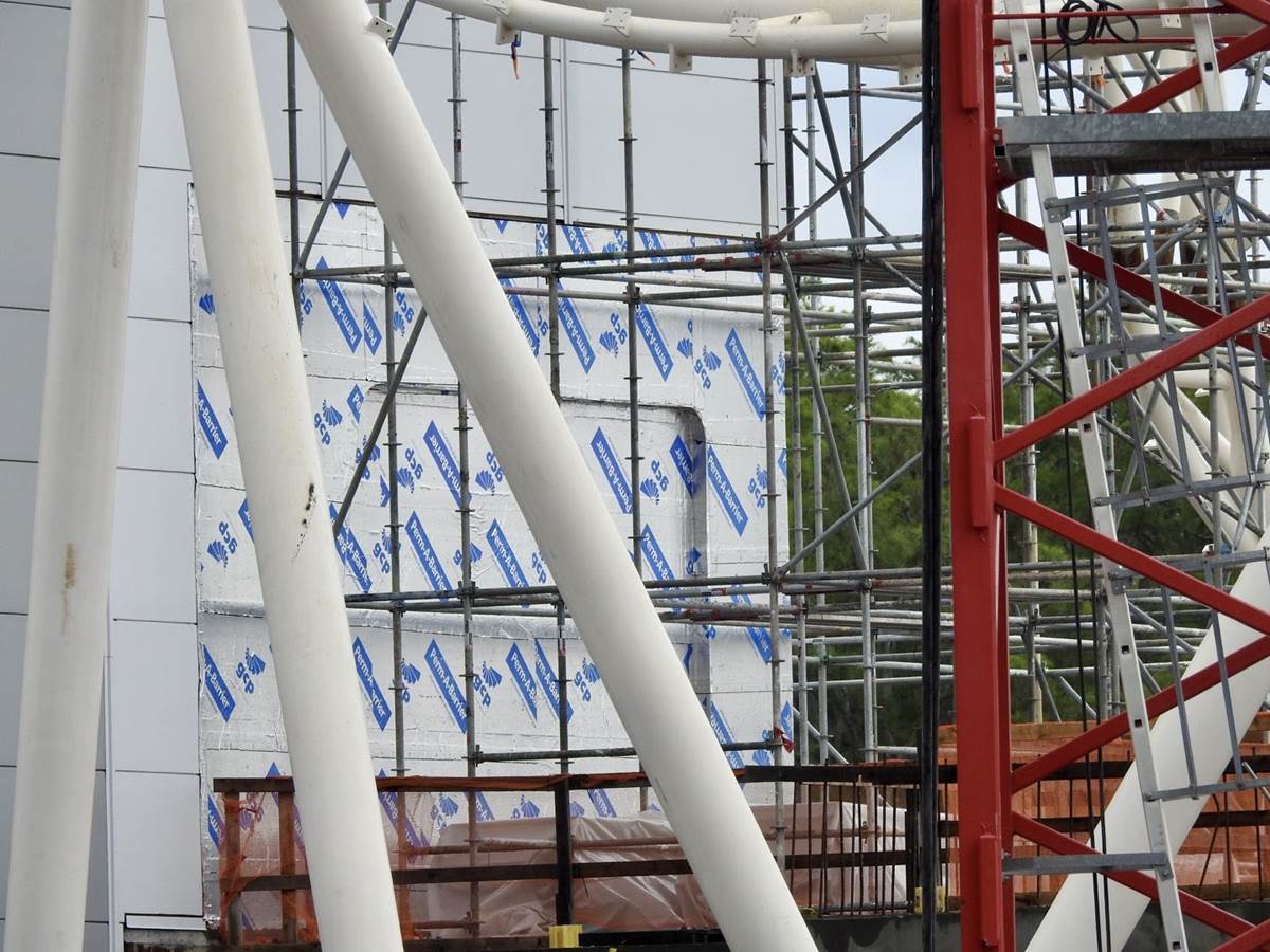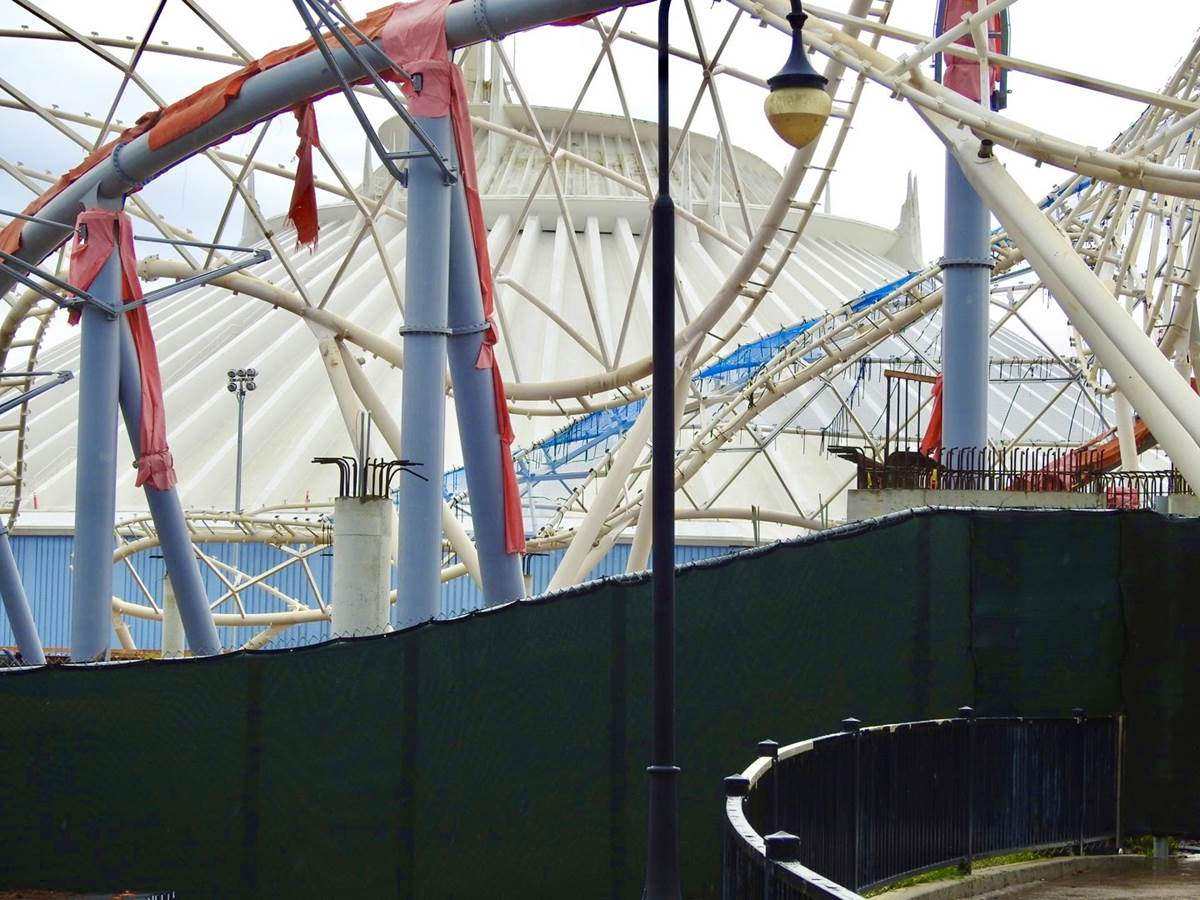 - Previously we noted that the holes where the coaster goes from the exterior portion of the track returning to the interior show building have been sealed, not just a shut storm door or anything, but completely sealed to seamlessly match the rest of the exterior of the building. Those entry and exit points are once again open.