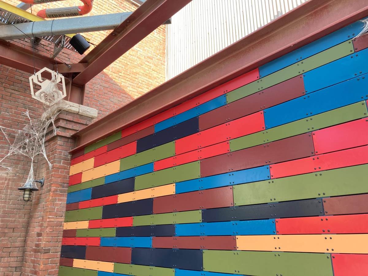 The WEB Brick wall can be found in the queue for WEB SLINGERS: A Spider-Man Adventure. The wall features multicolored layers making any photo pop.