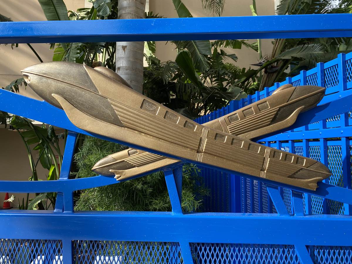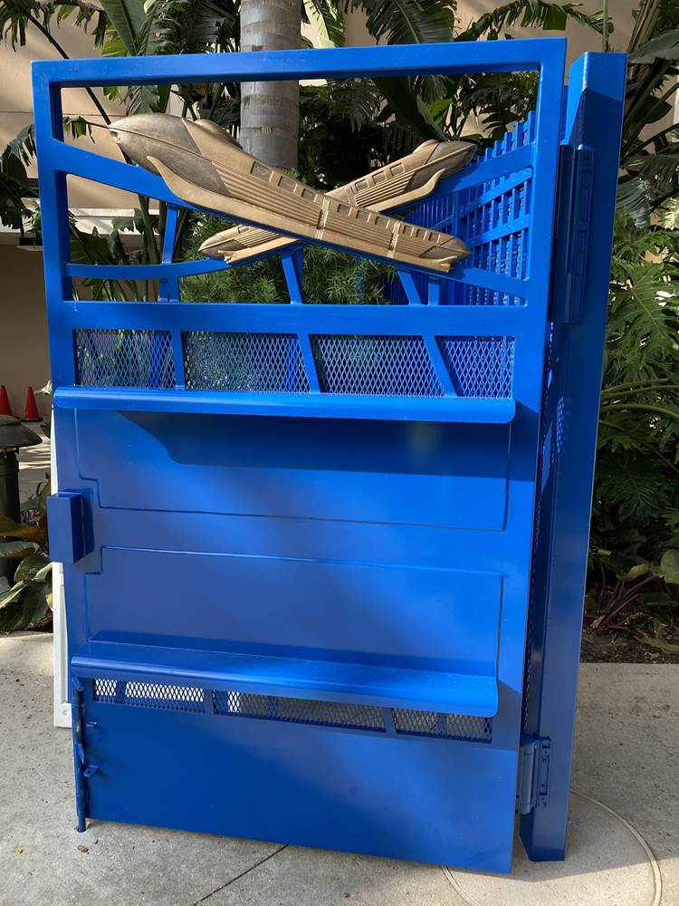 - The gates are the signature blue of the Disneyland Hotel, and adorned with metal monorails reminiscent of the monorail water slides at the hotel’s E-Ticket pool, literal steps away from the new gates.