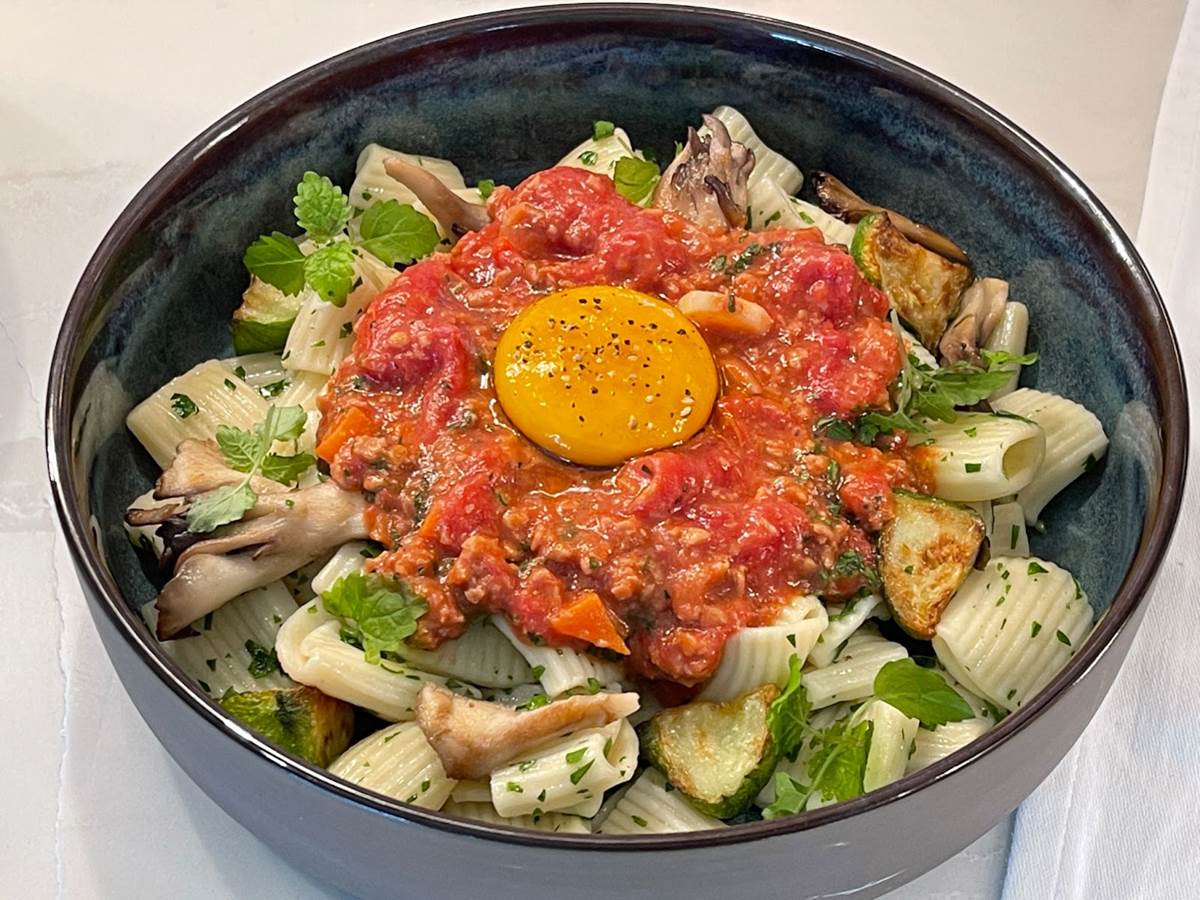 House-made rigatoni includes seasonal vegetables and vegan “egg yolk.”
