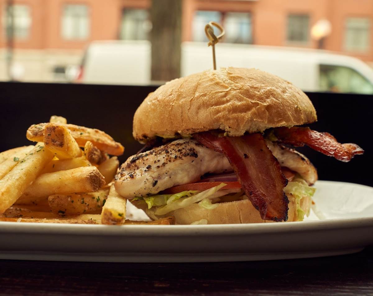 - Grilled Chicken Sandwich – Grilled chicken breast, applewood-smoked bacon, french fry aioli, shredded iceberg, vine-ripened tomato, red onion, avocado jalapeño sauce, Kaiser roll