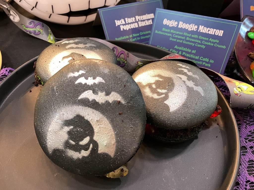 - Oogie Boogie Macaron – Black macaron filled with green apple buttercream, caramel, brownies, cookie crumb dust, and gummy candy