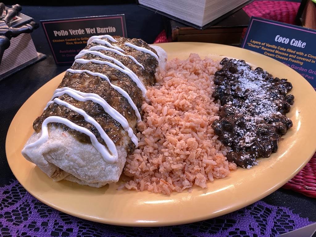 - Pollo Verde Wet Burrito – Chicken cooked in grilled salsa verde, golden rice, black beans, and crema
