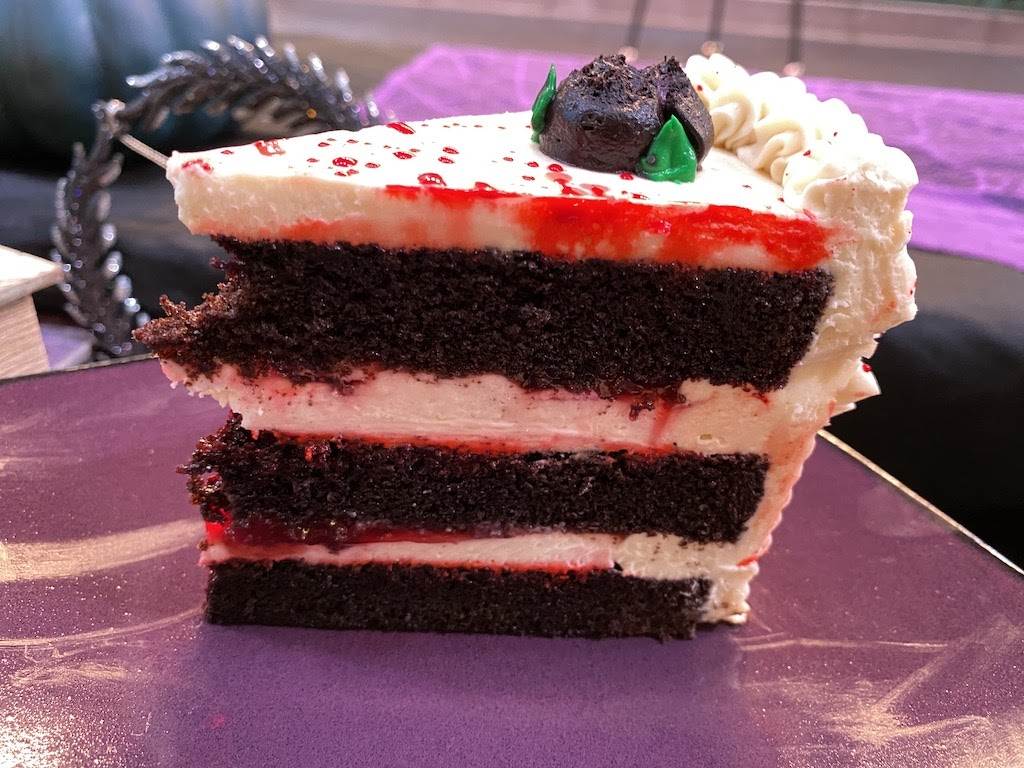 - Chocolate Cherry Cake – Chocolate cake with buttercream frosting, sour cherries, and cream cheese filling finished with a splatter of cherry sauce