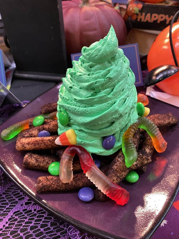 - Halloween Candy Sundae – Two sundaes in one: sour gummy ice cream with raspberry sauce, gummy treats, and fruit candies; and chocolate ice cream with hot fudge and pieces of chocolate candy bars
