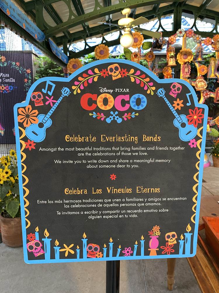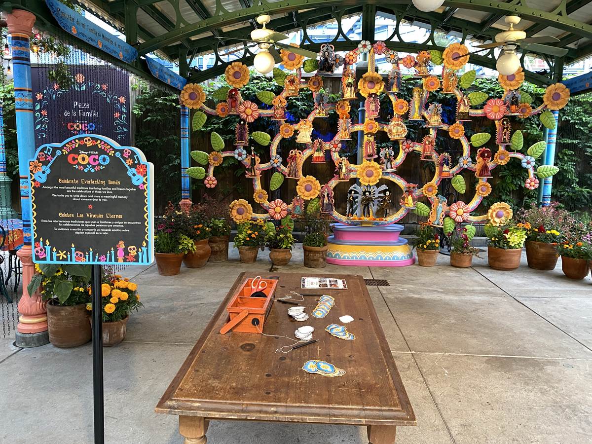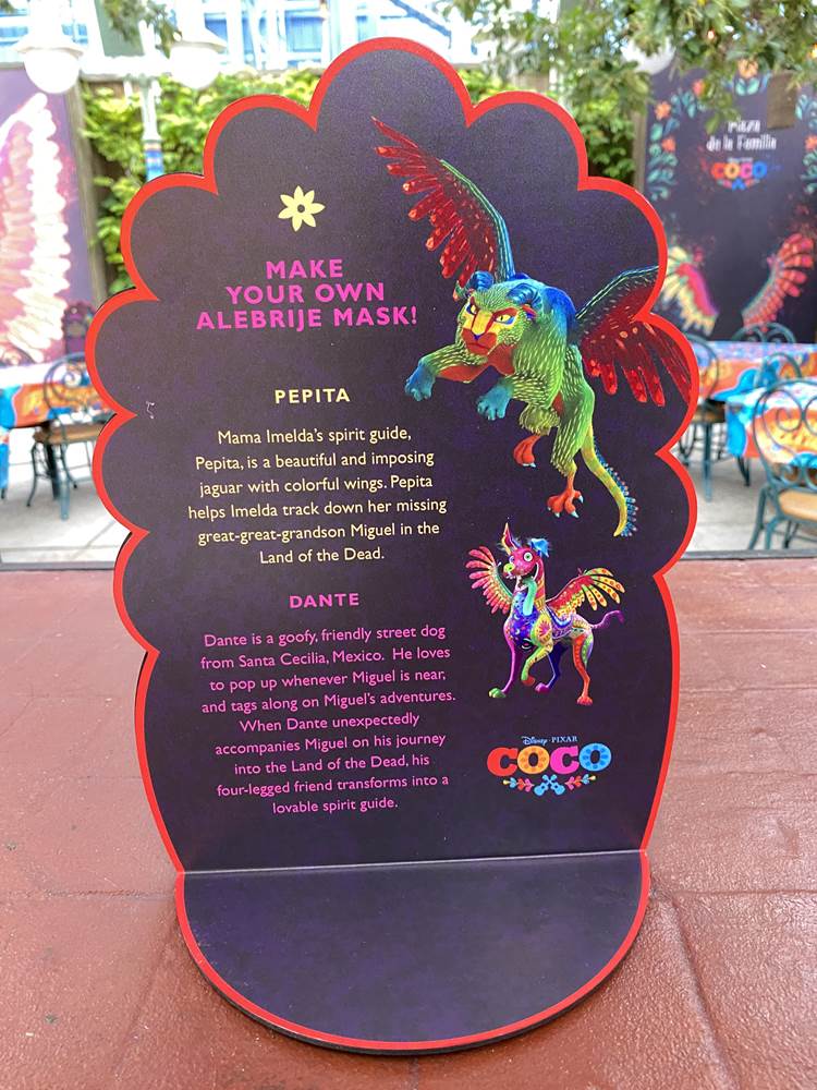 - In between performances of A Musical Celebration of Coco, guests can meet and create special memories with the film’s main character, Miguel, and post personal messages to their loved ones on the Memory Wall. Then stroll over to the iconic Mexican Árbol de la Vida (Tree of Life) to take a photo and design their own paper alebrije masks of Dante and Pepita, spirit guides from Coco.