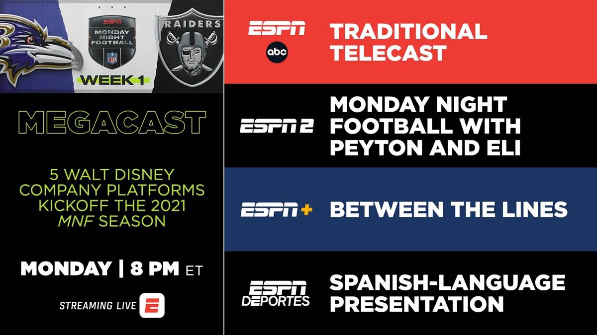 - Between the Lines on ESPN+ joins the traditional telecast (ESPN and ABC) along with the previously announced Monday Night Football with Peyton and Eli (ESPN2) and the Spanish-language telecast (ESPN Deportes).