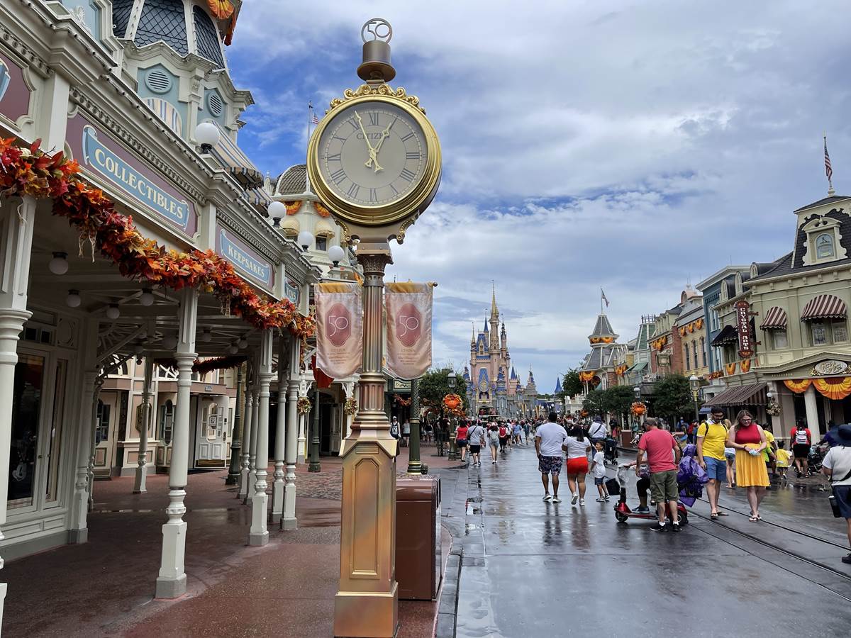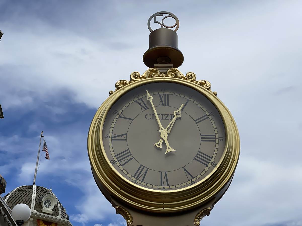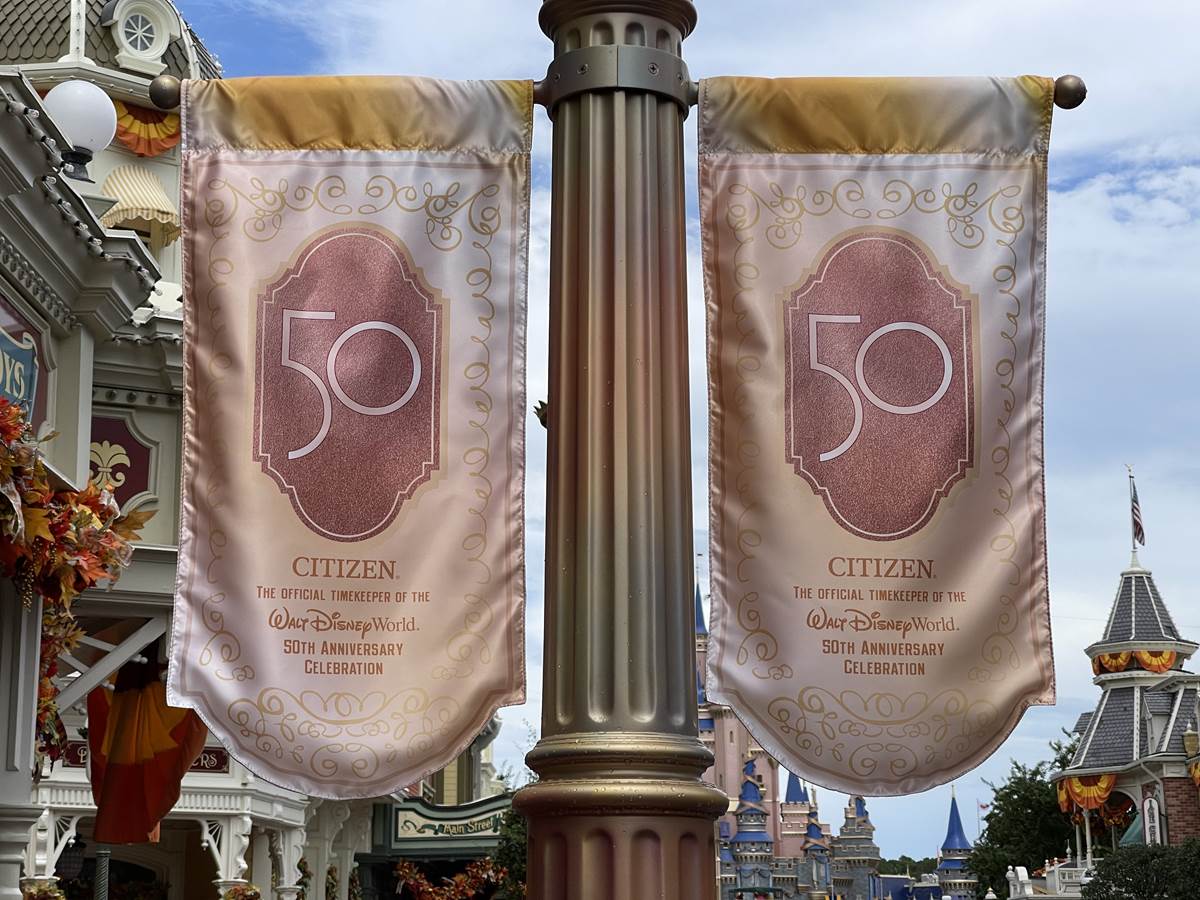 - Underneath the actual timepiece, beautifully restored for the 50th anniversary festivities, are two banners with the soon to be iconic “50” that remind Main Street USA pedestrians that Citizen is the official timekeeper of the Walt Disney World 50th Anniversary Celebration. At the top of the clock, you can also find another “50” adornment.