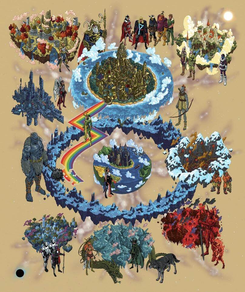 - Illustrator Andrew DeGraff: “I grew up on Marvel Comics, and they've been a huge influence on me. Thor, in particular, was pretty special, so the Ten Realms of Asgard was a treat. Initially, I played with the idea of hemispherical planets that were perhaps a little too married to a cosmic aesthetic, and focused on creating wildly different landscapes. Next, we added characters to contextualize the Realms, which really helped to clear up the icier regions of Niflheim, Nidavellir, and the Jotunheim. Before going to final, we “un-planeted” the realms, envisioning them as sort of floating magical islands, which I think really works. Asgard remains a sort of utopian disc, while the others are more organic. Midgard/Earth remains the only hemispherical world, as it’s not on the same purely mystical plane as the others.”