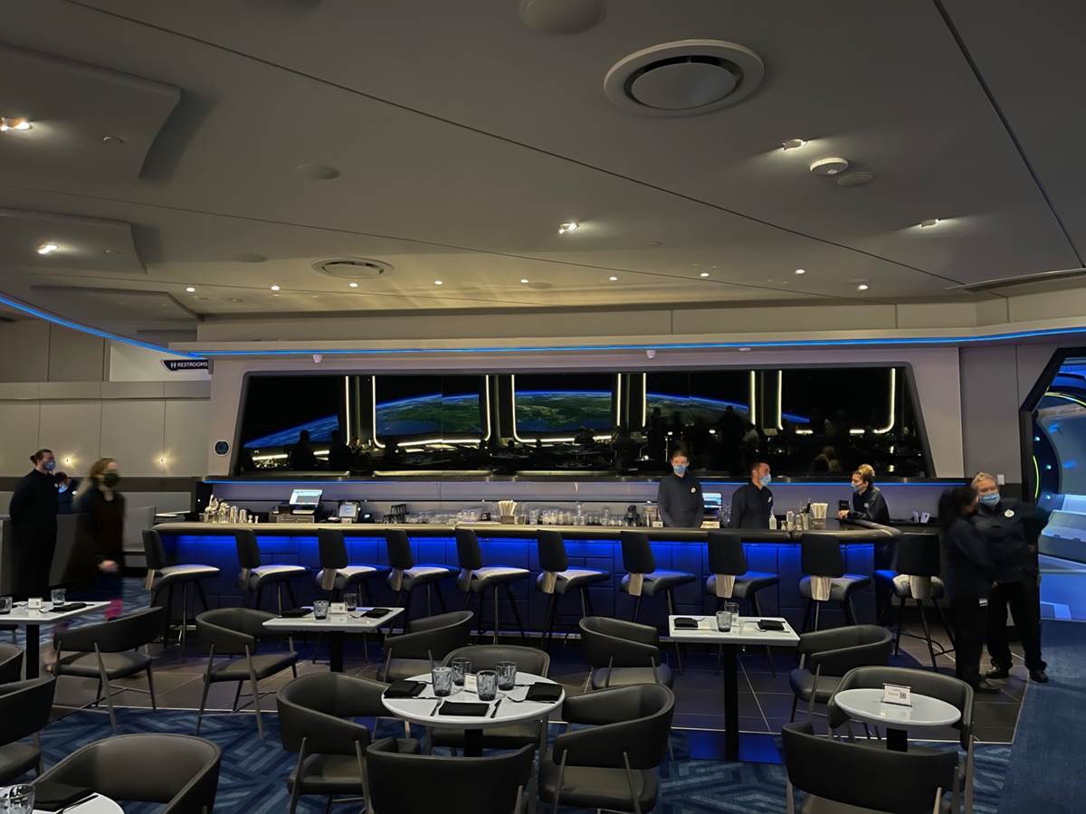 Once docked, you will head to the Centauri Space Station-themed dining area, featuring panoramic views of Earth along with a variety of work and leisure activities taking place outside.