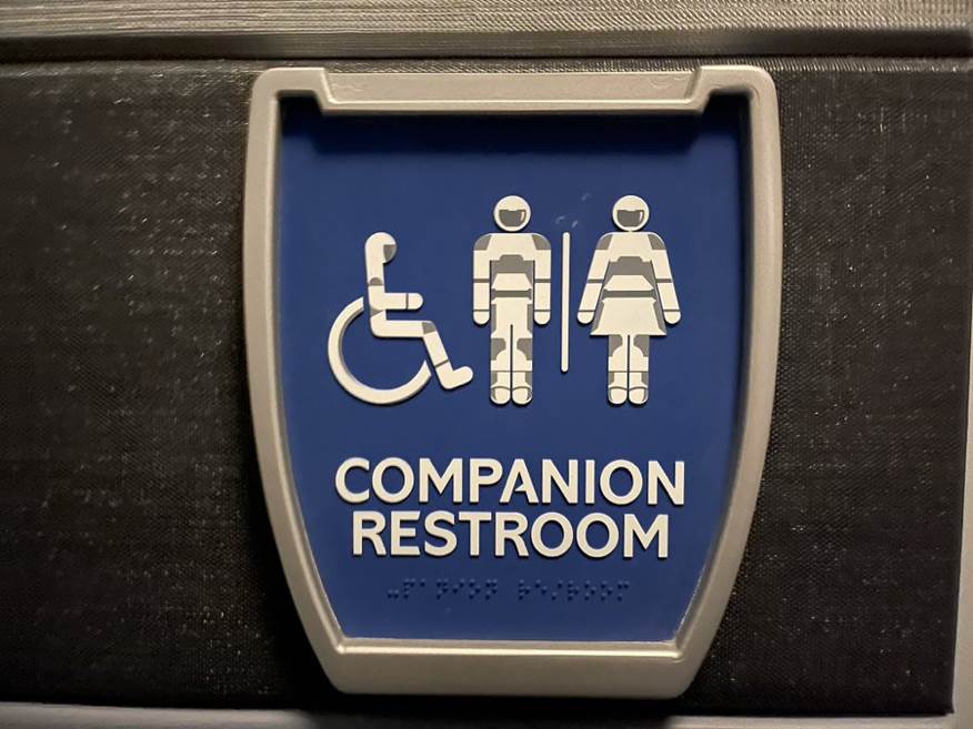 Restroom signs are themed, and have announcements saying that restrooms in space work the same as on earth.