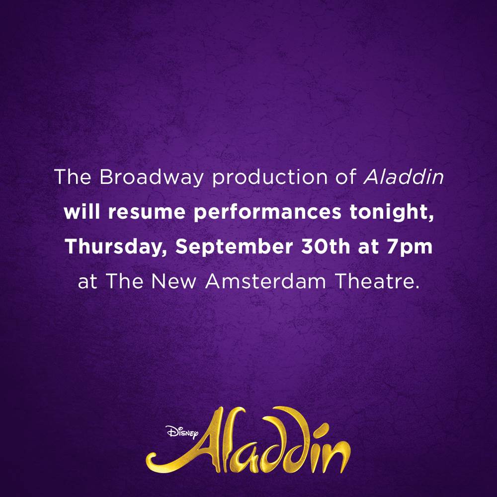 - The official Twitter account of Aladdin the Musical has tweeted that the Broadway Production of Aladdin will resume performances tonight, Thursday, September 30th at 7:00 PM ET at the New Amsterdam Theatre.