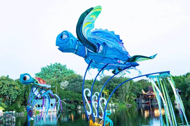Happening several times daily at the Discovery River Theater near DinoLand U.S.A. (former home of Rivers of Light), guests make their way into the space, joined by a team of performers bringing with them a colorful collection of oversized props and kites adorned with Disney animal friends from The Little Mermaid, A Bug’s Life, and Finding Nemo. Original, worldbeat arrangements of favorite Disney tunes fill the air, and the excitement builds toward the launch of an impressive show of kites over the lagoon.