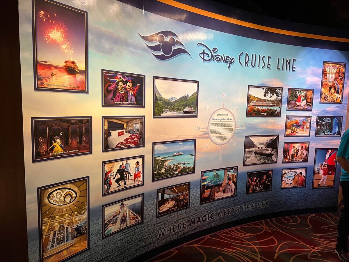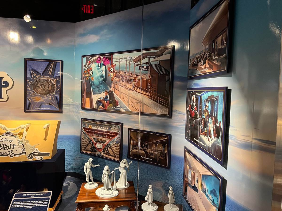 - The back wall of the display features photos of various offerings found on the currently operating Disney Cruise Line ships, in addition to concept art for Disney Wish exclusive offerings.