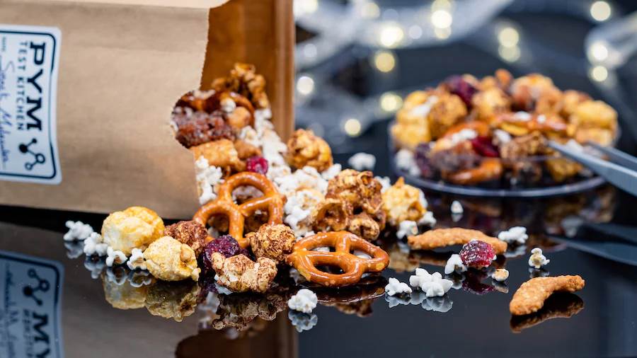 - Holiday Snack Molecules – Gingerbread and Mexican hot chocolate caramel corn, mini pretzels, honey-roasted peanuts, dried cranberries, and popped sorghum