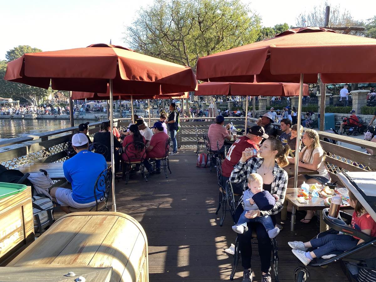 From this area, those seated here will have ample viewing of the Rivers of America and all the happenings on the water, including the various boats like the Mark Twain, the Sailing Ship Columbia, the Davy Crockett Explorer Canoes, and the rafts to Tom Sawyer Island.