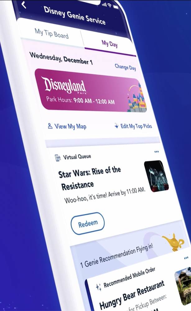 - Built into the Disneyland App, Disney Genie includes a personalized itinerary feature that can quickly map out an entire day.