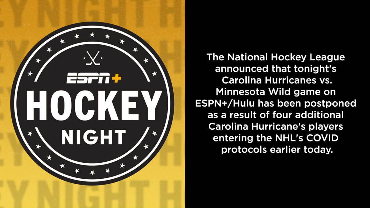 The National Hockey League (NHL) have announced that tonight’s Carolina Hurricanes vs. Minnesota Wild game on ESPN+ and Hulu has been postponed.