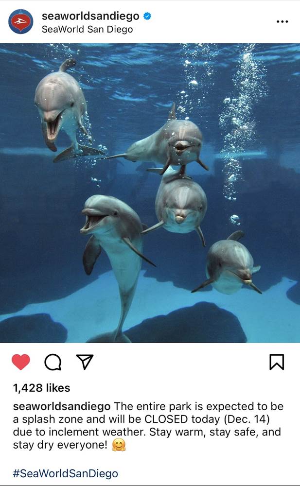 - Knott’s Berry Farm, SeaWorld San Diego and Six Flags Magic Mountain all announced via their Twitter or Instagram accounts that they will be closed today, December 14th, due to inclement weather.