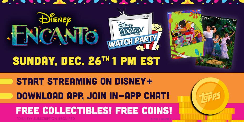 D23 on twitter announced an Encanto Watch Party in the Topps Disney app on Sunday December 26th at 1PM ET.