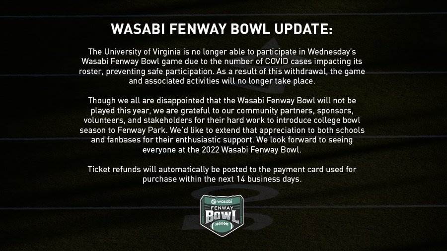 Due to the number of COVID cases impacting its roster, the University of Virginia is no longer able to participate in the upcoming Wasabi Fenway Bowl game.