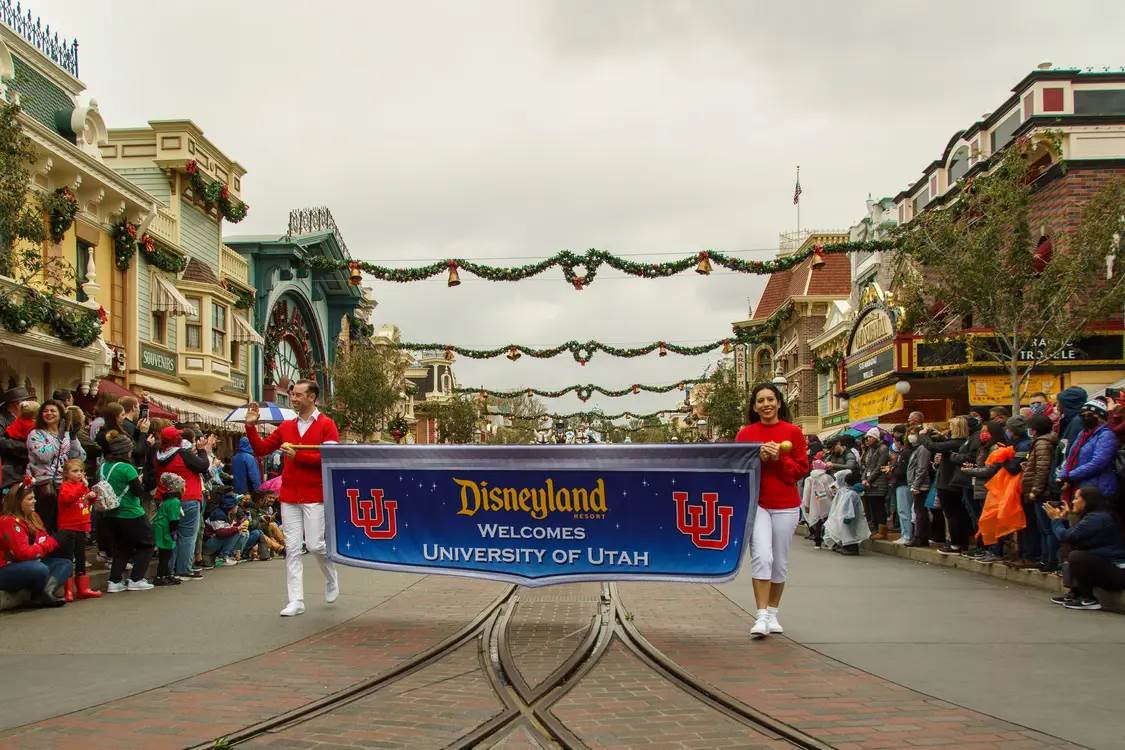 Today, the head football coaches and select players from the Ohio State University Buckeyes and the Utah Utes visited Disneyland to participate in a special cavalcade and take a picture with Mickey Mouse.