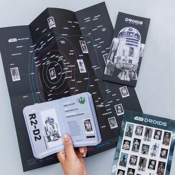 - This collector’s item showcases some of the most iconic droids through a sheet of stamps and includes a companion booklet giving the various back stories of some of the most famous droids in the Star Wars Universe.