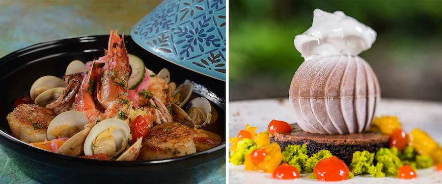 - As this spot welcomes you again, try the Seafood Tagine. Filled with prawns, scallops, squid, and Littleneck clams. For a sweet finish, the returning Kilimanjaro dessert is not just gorgeous, but delicious too. Decadent dark chocolate mousse, pistachio financier, pink peppercorn meringue, cacao nib crunch, and ras el hanout pineapples.