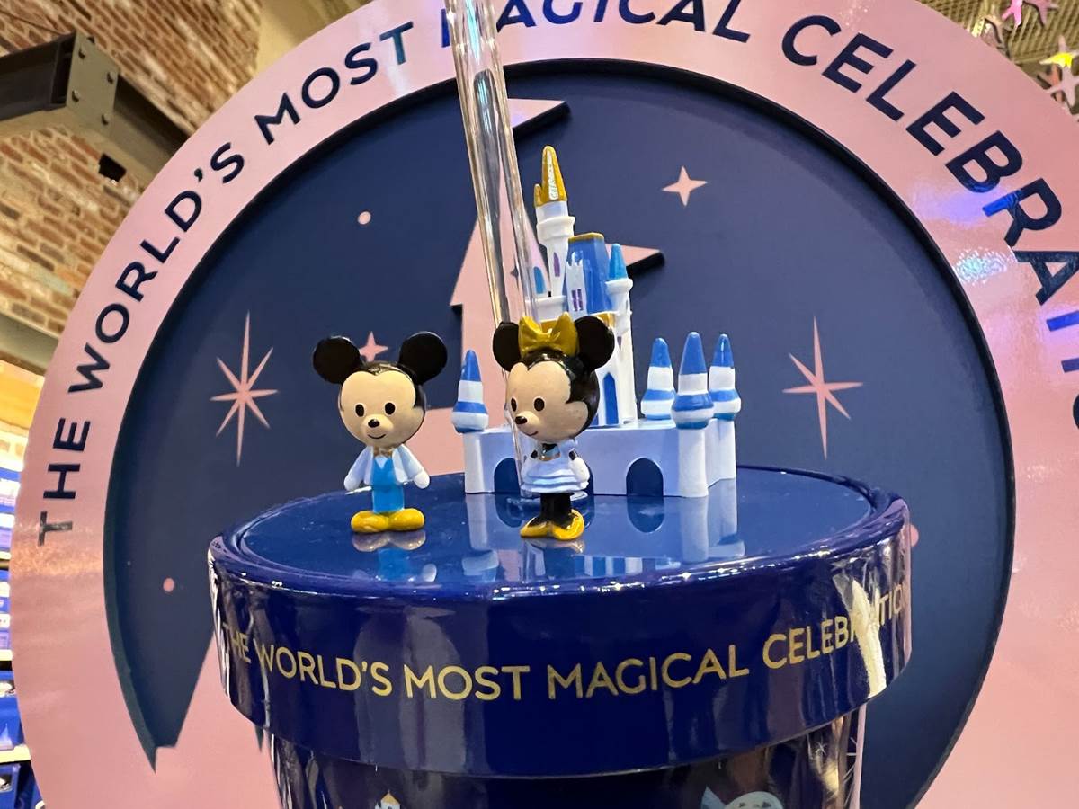 A wonderful new tumbler for the 50th anniversary of Walt Disney World, featuring cute, Mary Blair-esque versions of Mickey and Minnie atop the cup.