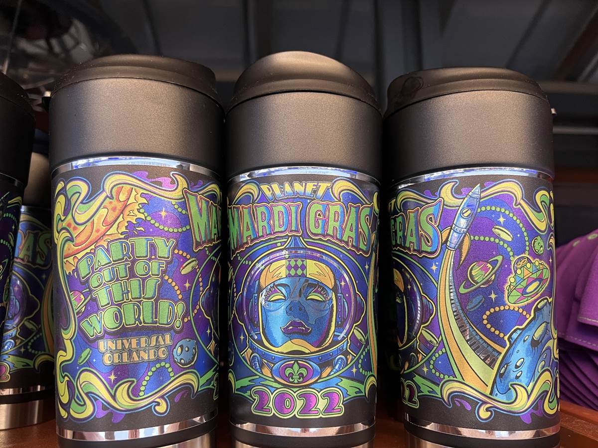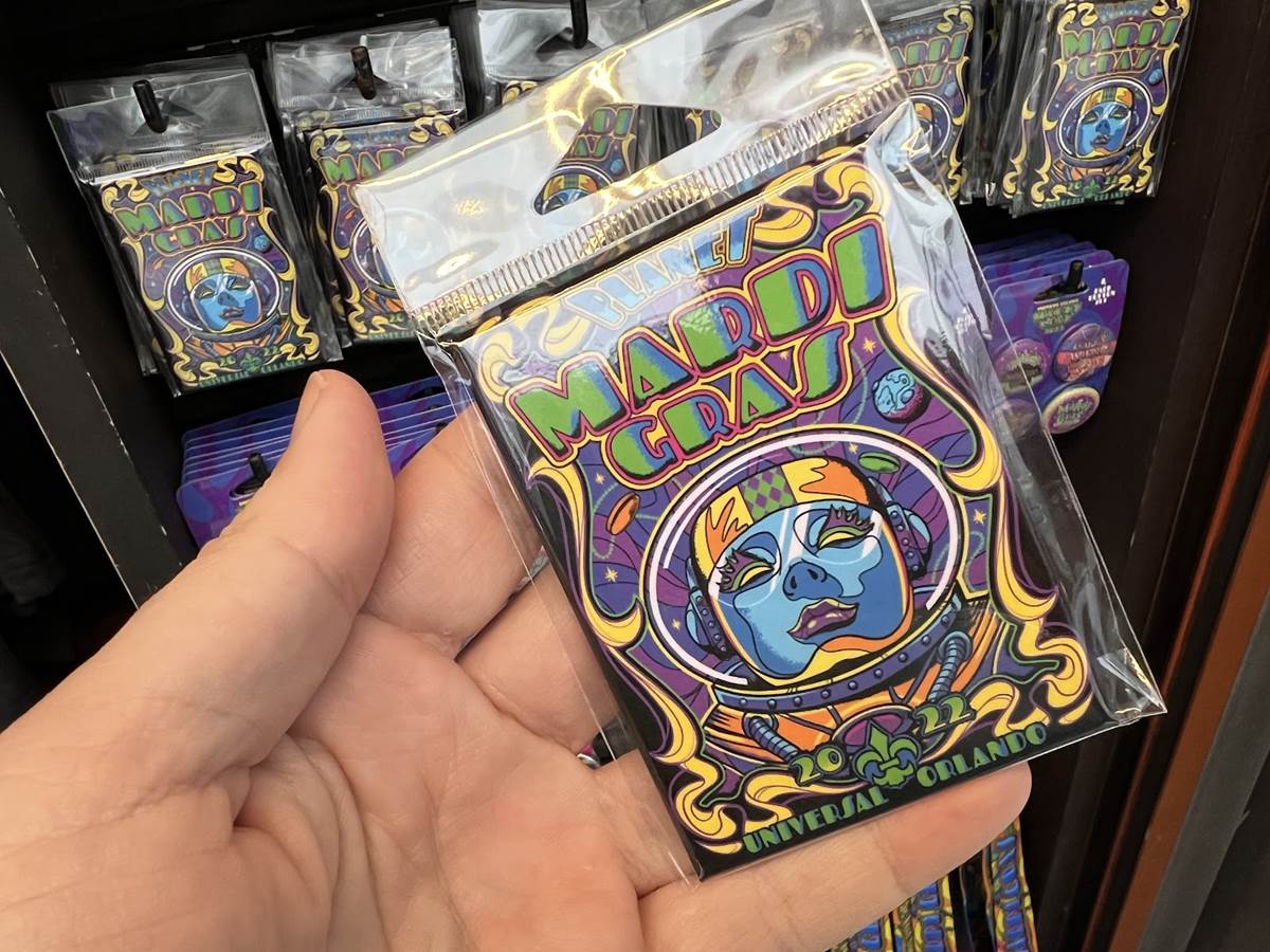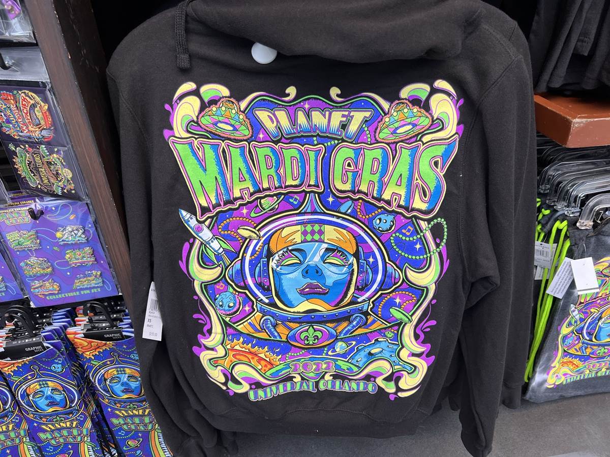 To celebrate this year’s parade you’ll find plenty of merchandise with the Planet Mardi Gras artwork, adorned on cinch-bags, t-shirts, pins, hoodies, and more. We spotted this collection of Mardi Gras Merchandise at the store located at the exit of The Bourne Stuntacular, still referred to as Cyber Image on the Universal App. The name is a remnant of the Terminator 2: 3-D attraction that would exit into the store. Though we spotted this selection at this specific location, Mardi Gras Merchandise is sold throughout Universal Studios Florida and beyond, with a Mardi Gras Voodoo Boutique also located at neighboring Islands of Adventure.