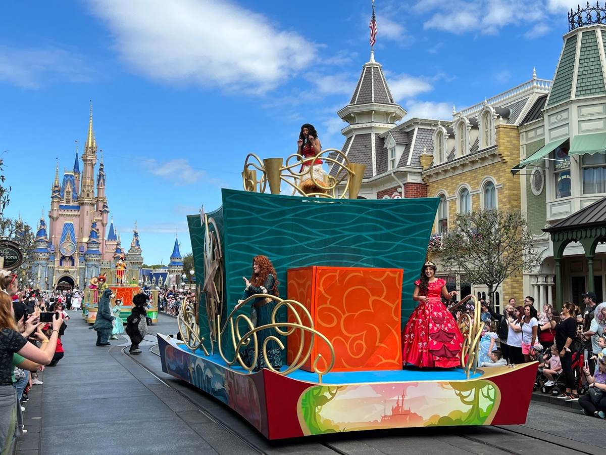 The first float features Princess Elena, Merida, Moana, Pocahontas and Mulan