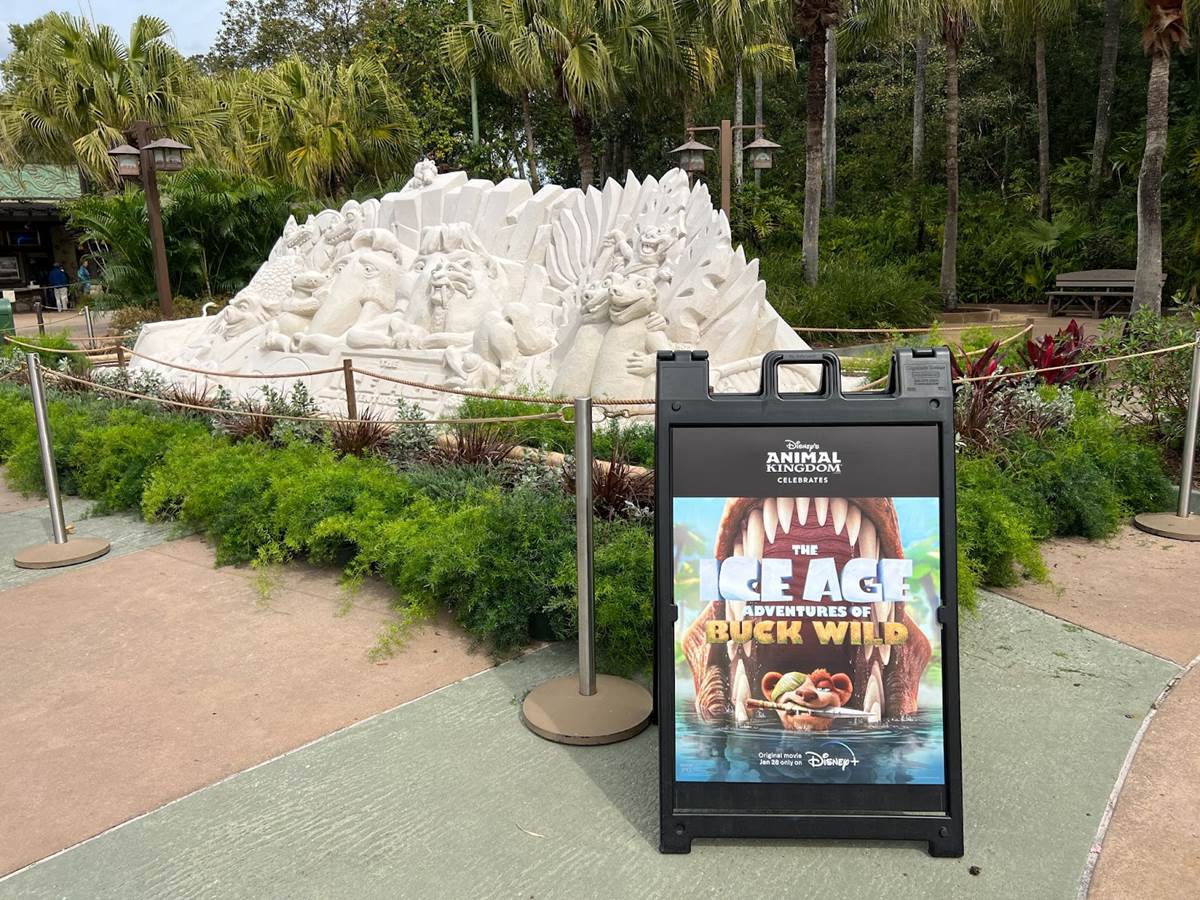 In keeping with a recent tradition at Disney’s Animal Kingdom, a new sand sculpture has been created at the entrance of the park, promoting the debut of the new Disney+ film The Ice Age Adventures of Buck Wild.