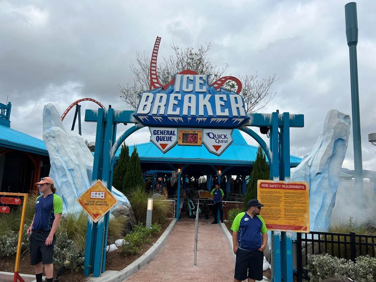 - Named after the icy Arctic summits, Ice Breaker will feature four airtime filled launches, both backwards and forwards, culminating in a reverse launch into the steepest beyond vertical drop in Florida – a 93 feet tall spike with 100-degree angle. The thrills continue as riders fly over a near vertical tophat maneuver into a series of exciting twists, turns, and airtime hills.
